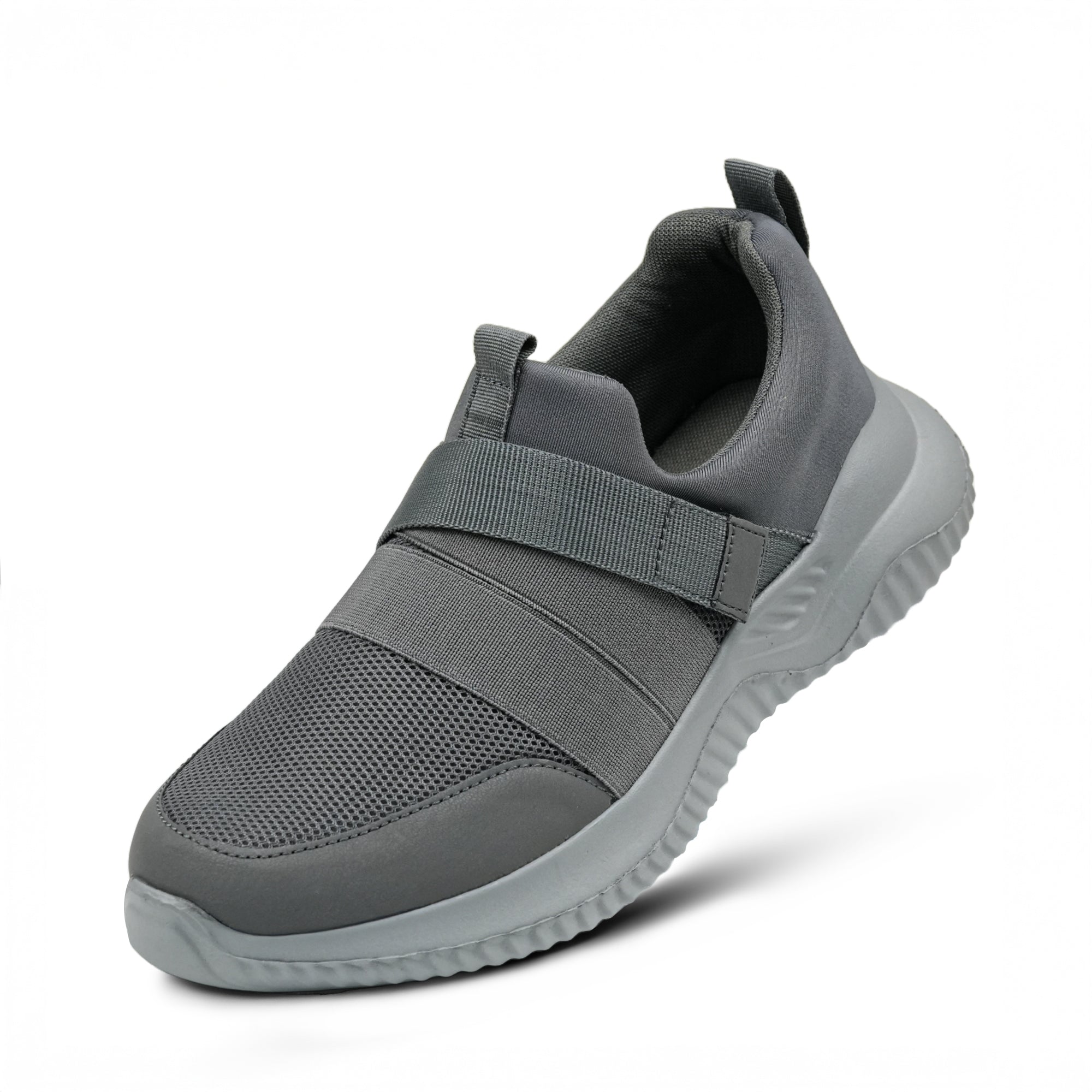 This sleek grey slip-on athletic shoe combines style and functionality, making it perfect for everyday wear and light workouts. The shoe features a breathable mesh upper for optimal ventilation, ensuring your feet stay cool and comfortable throughout the day. The elastic strap across the midfoot provides a secure fit, while the cushioned sole offers excellent support and shock absorption. The pull tabs at the tongue and heel make it easy to slip on and off, adding convenience to your active lifestyle.